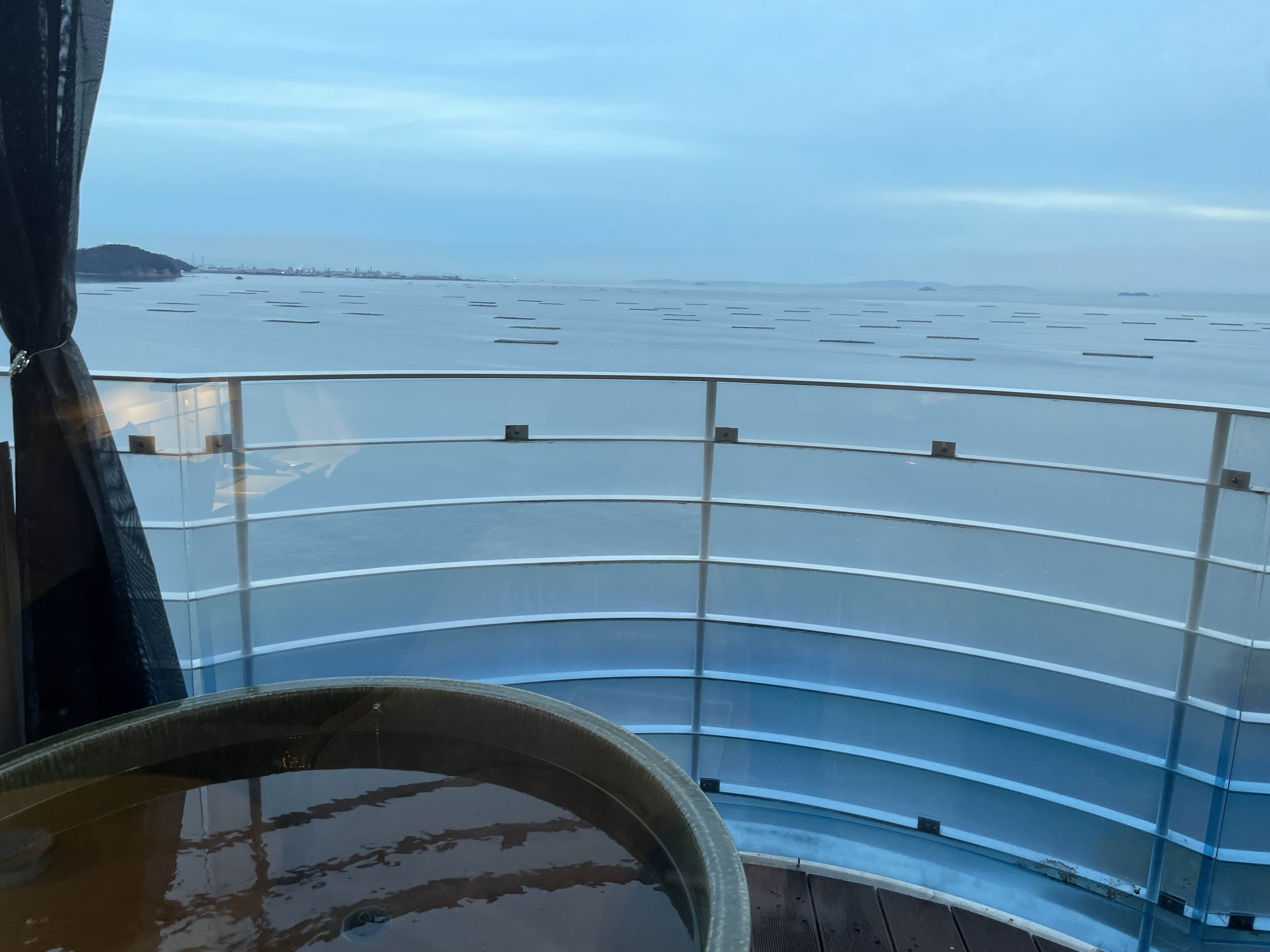 바다로 종종 배가 지나가서 좀 민망해서 커텐치고 온천을 즐겼다.