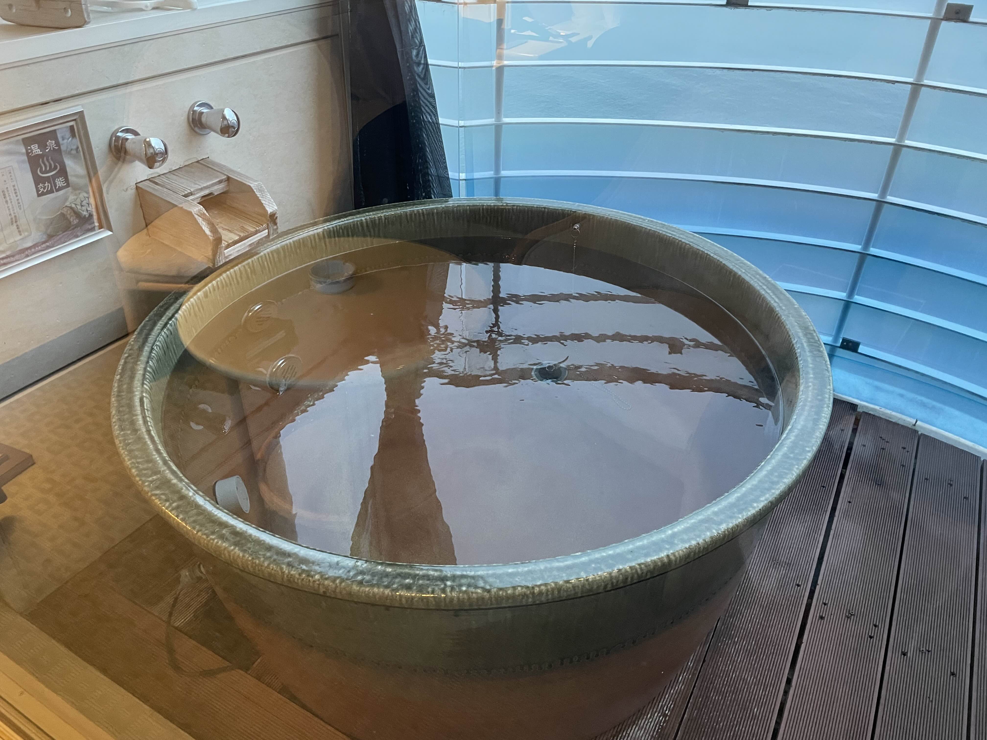 방에 들어가면 이미 원형의 도자기탕에 온천물이 준비되어 있다.